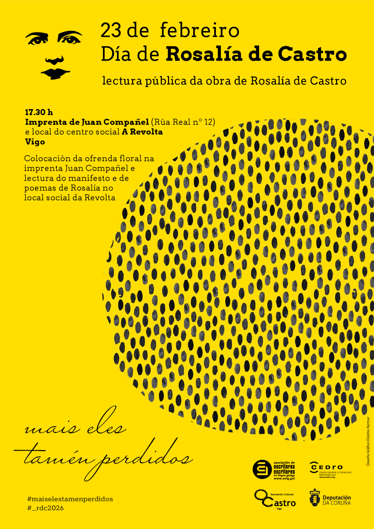 O luns, segunda feira, 23 de febreiro, ás 17:30 horas, coorganizado pola AELG e a Asociación Cultural O Castro, na Imprenta de Juan Compañel (Rúa Real nº 12) e Local do Centro Social A Revolta), terá lugar a colocación da ofrenda floral na imprenta Juan Compañel, a lectura do Manifesto da AELG e de poemas de Rosalía no local do Centro Social da Revolta.