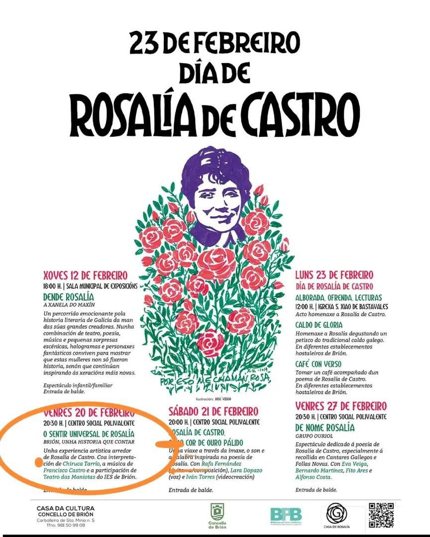 O acto central do Día de Rosalía de Castro terá lugar o domingo 22 de febreiro, ás 12:00 horas, no Panteón de Galegos Ilustres (San Domingos de Bonaval), en Santiago de Compostela. A entrada será libre e gratuíta.