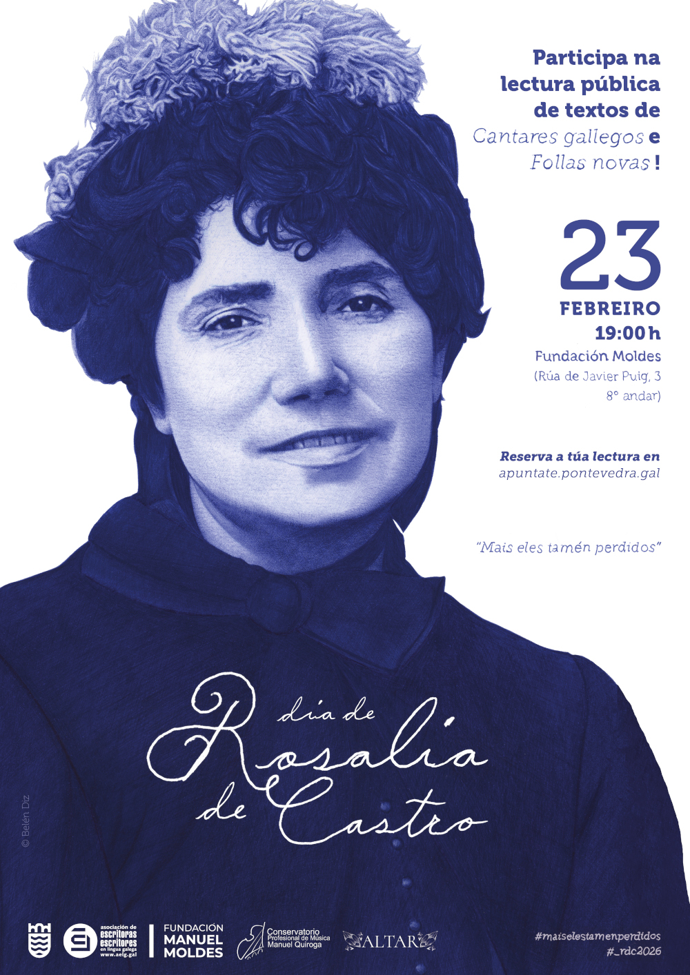 A documentación gráfica xerada por estas actividades será compartida nas correspondentes redes ou medios de difusión do centro educativo, arredor do 23 de febreiro, ou ese mesmo día, coa etiqueta #maiselestamenperdidos e #_rdc2026. A AELG comprométese a colaborar na difusión da mesma a través da súa web e redes sociais, para o que agradecemos que se envíe noticia das actividades ao correo oficina@aelg.org. A este mesmo correo podedes comunicarnos a vosa intención de participar nesta iniciativa ou noutras coas que o voso centro celebre o Día de Rosalía 2026, para a irmos facendo constar na nosa web: https://www.aelg.gal/actividades/dia-de-rosalia-de-castro/2026/2/22/dia-de-rosalia-de-castro-2026