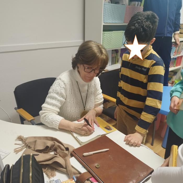 Asinando libros despois do debate sobre o libro Debaixo dun parasol co alumnado do CEIP de San Roque.